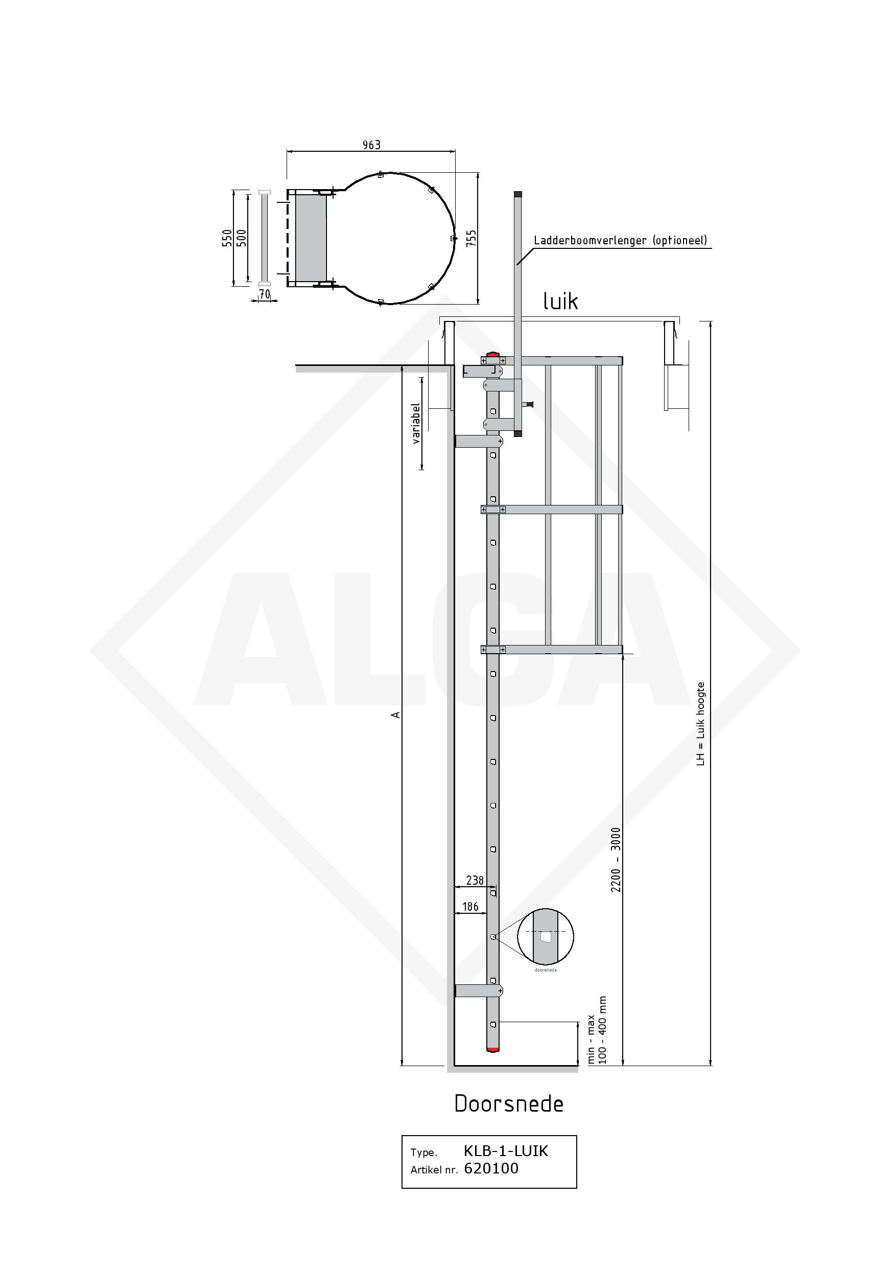 Deze aluminium kooiladder is geschikt voor een dakluik hoogte van 9,95 m. tot maximaal 10,20 m. De uitstaptrede hoogte noemen wij de A-hoogte. Al onze kooiladders worden op maat gemaakt! Door de eenvoudige muurbeugels (geklemd) en uitstaptrede (geklemd) is deze kooiladder in no time gemonteerd. De kooiladder KLB-1-LUIK voldoet gecombineerd met een ladderboomverlenger of handgreep op het luik aan de norm NEN-EN-ISO 14122-4 ✓