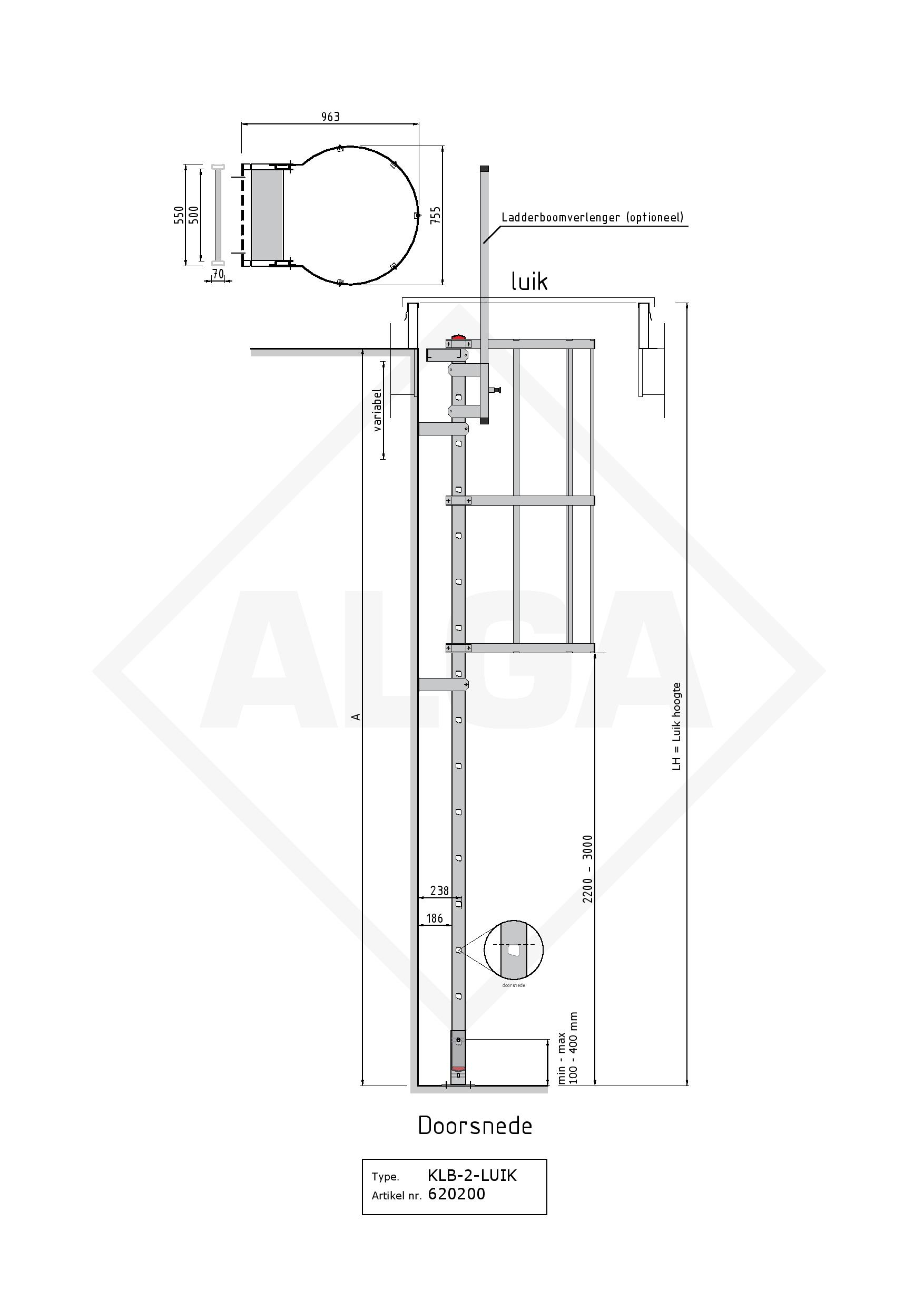 Deze aluminium kooiladder is geschikt voor een dakluik hoogte van 3,21 m. tot maximaal 3,40 m. De uitstaptrede hoogte noemen wij de A-hoogte. Al onze kooiladders worden op maat gemaakt! Door de eenvoudige voetplaten, muurbeugels (geklemd) en uitstaptrede (geklemd) is deze kooiladder in no time gemonteerd. De kooiladder KLB-2-LUIK voldoet gecombineerd met een ladderboomverlenger of handgreep op het luik aan de norm NEN-EN-ISO 14122-4 ✓