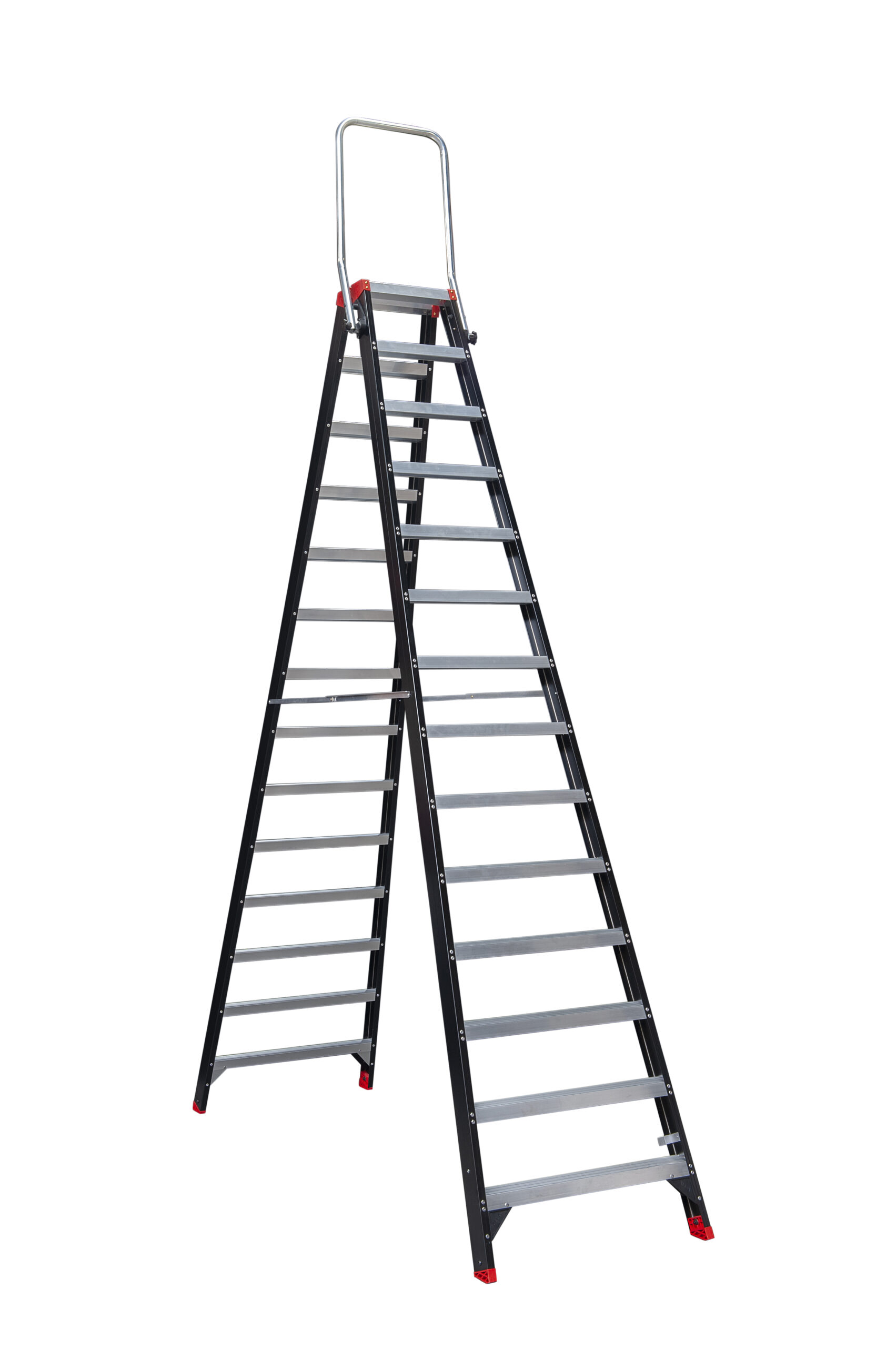 De Mammoet dubbele trap van ALGA is de dubbele trap voor bouw en industrie. Deze dubbele trap 14 treden is geschikt voor gebruik onder zware omstandigheden. De MAMMOET dubbele trap is uitgevoerd met antislip treden van dubbel aluminium kokerprofiel. De treden zijn met een dubbele constructie in de trapstijlen bevestigd. Deze trap heeft dan ook glansrijk de test met 350KG testbelasting doorstaan. Deze trap wordt standaard geleverd met een door handige draaiknop instelbare steunbeugel. De vuilafstotende coating voorkomt zwarte handen bij intensief gebruik. En dankzij de brede rubberen trapvoeten werk je met deze professionele dubbele trap stabiel en veilig✓